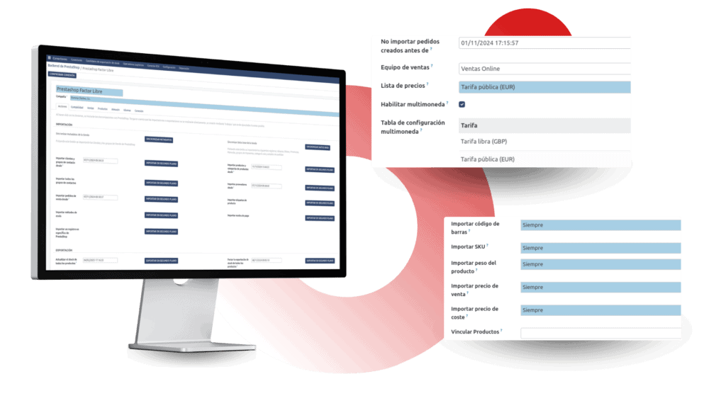 Gracias a su compatibilidad con la gestión multitienda y multimoneda, es ideal para negocios que operan en distintos mercados. También controla el establecimiento de la divisa que corresponde para pedidos importados, establecer posiciones fiscales e impuestos automáticamente y gestionar referencias de seguimiento para los envíos.
