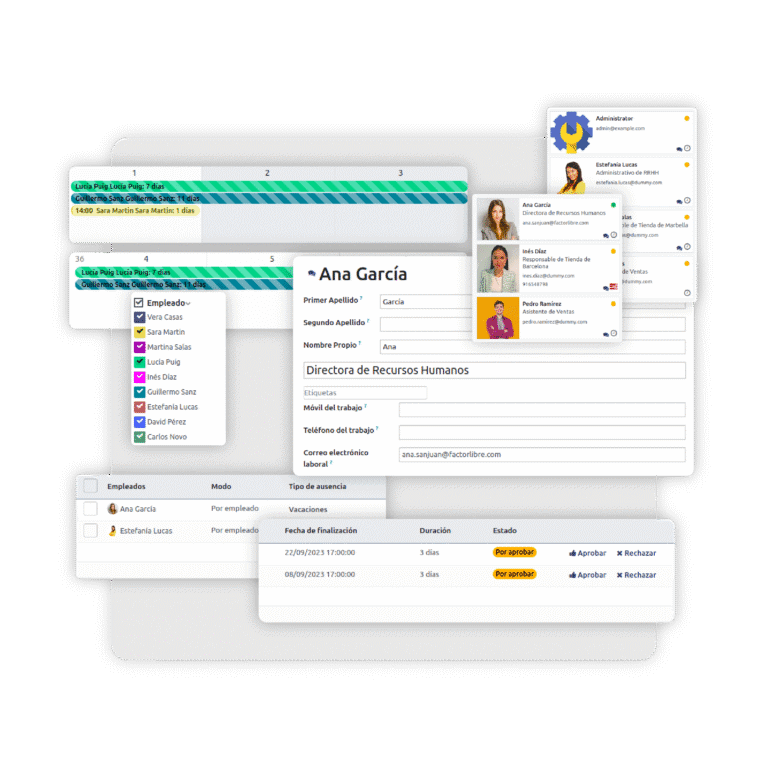 El cumplimiento normativo es un aspecto esencial en la gestión de RRHH. Este paquete incluye un sistema de control horario conforme a la legislación española, registrando las horas de trabajo de cada empleado y automatizando el cálculo de horas extraordinarias. La gestión de ausencias también se ha optimizado, permitiendo a los empleados solicitar vacaciones, permisos, bajas médicas y otros tipos de ausencia con un flujo de aprobación ágil y estructurado.