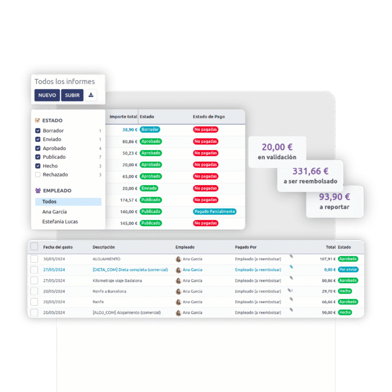 Cada gasto queda vinculado al perfil del empleado y sigue un flujo de validación estructurado. Los responsables pueden aprobar o rechazar cada solicitud con un simple vistazo, verificando el estado de los reembolsos en tiempo real. Además, la integración con contabilidad permite que el área financiera tenga una visión clara y organizada de todos los gastos, clasificándolos y generando informes detallados para evaluar la rentabilidad de cada actividad o proyecto.