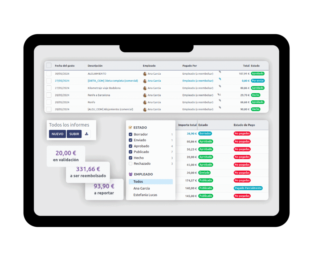 Cada gasto queda vinculado al perfil del empleado y sigue un flujo de validación estructurado. Los responsables pueden aprobar o rechazar cada solicitud con un simple vistazo, verificando el estado de los reembolsos en tiempo real. Además, la integración con contabilidad permite que el área financiera tenga una visión clara y organizada de todos los gastos, clasificándolos y generando informes detallados para evaluar la rentabilidad de cada actividad o proyecto.